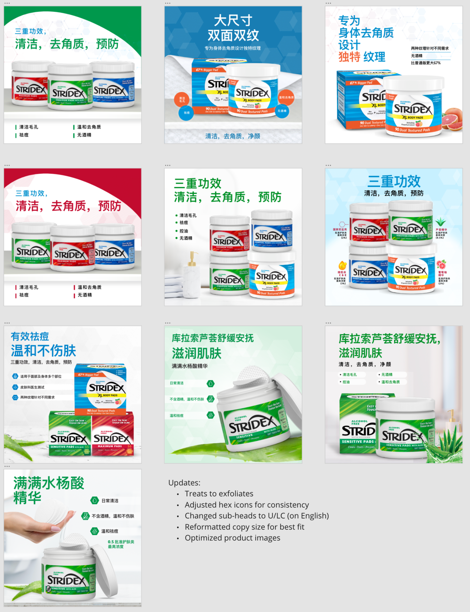 Social focus has slowed in recent years for Blistex and Stridex. Globally, campaign templates were created as for distributors to use as is or modify.